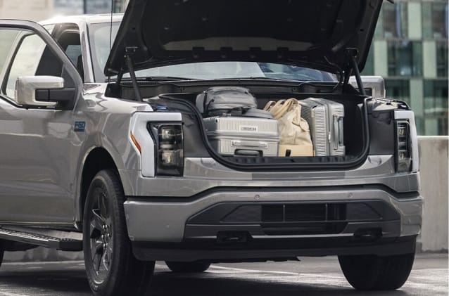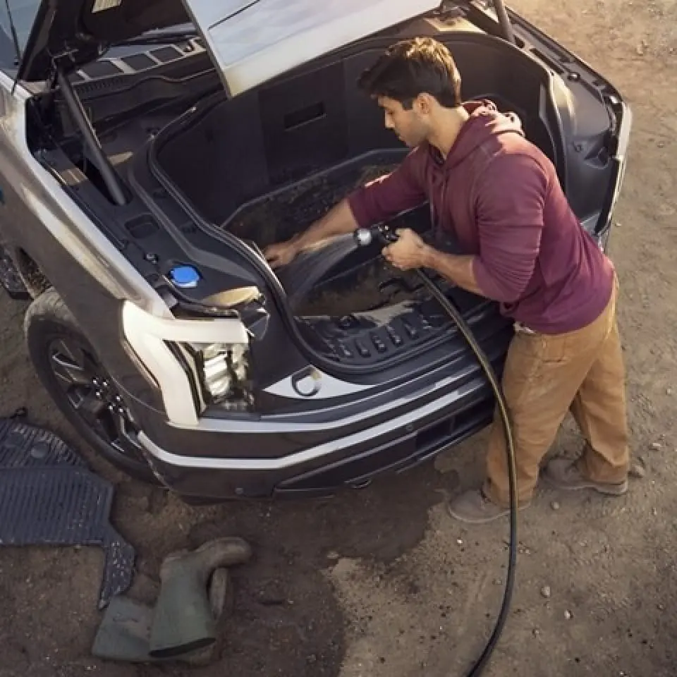 The Mega Power Frunk holds up to 400 lbs. Inside 14.1 cu. Ft. of lockable, waterproof, easy-to-clean space - along with multiple power outlets* for your gear.