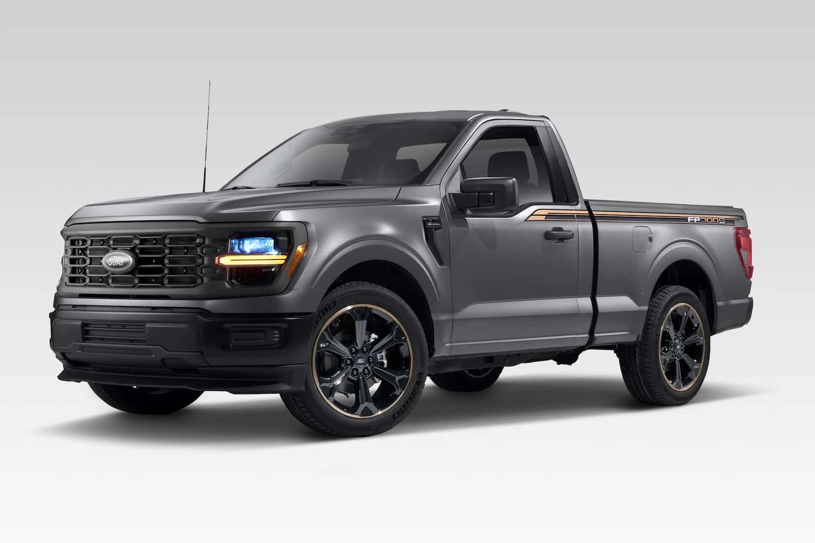 The F-150 FP700S is an aggressive Street Truck that starts with a 2024 Ford F-150 XL Regular Cab two-wheel drive configuration and adds a Ford Performance Lowering Kit and a Ford Performance Parts by Whipple Supercharger to the 5.0-liter V8. The upgrades transform a standard F-150 into a supercharged 700 horsepower and 590 pounds-feet of torque beast.
